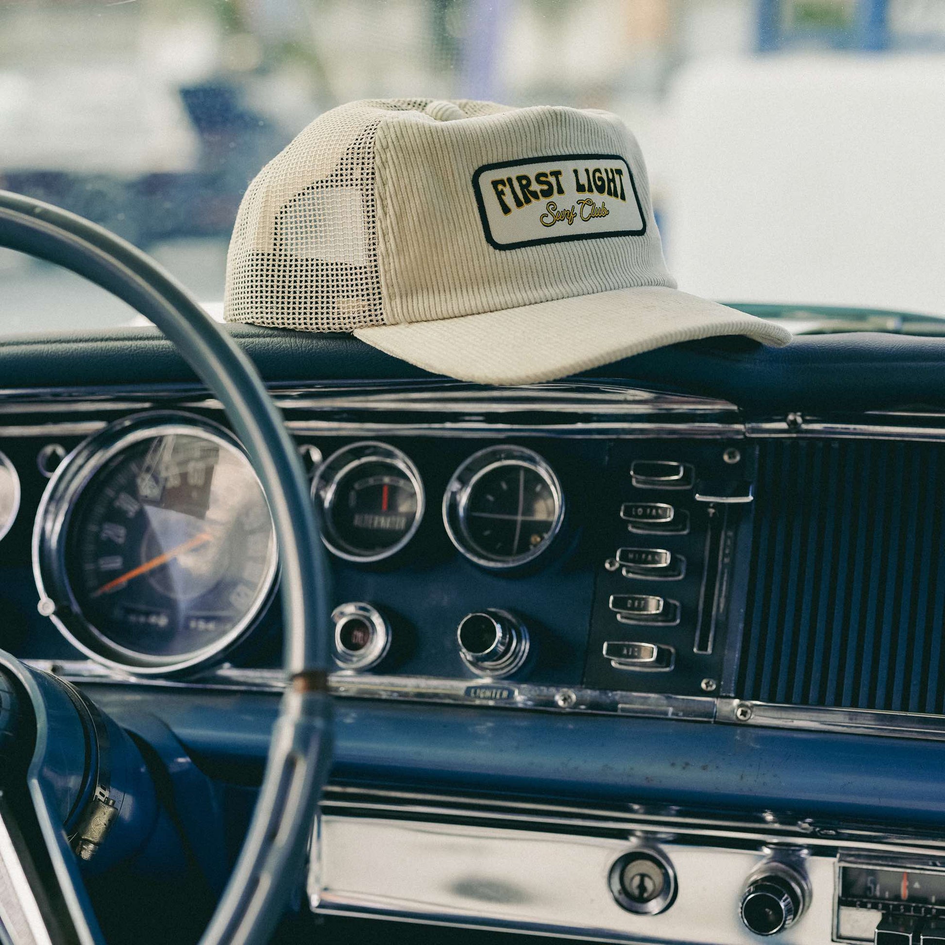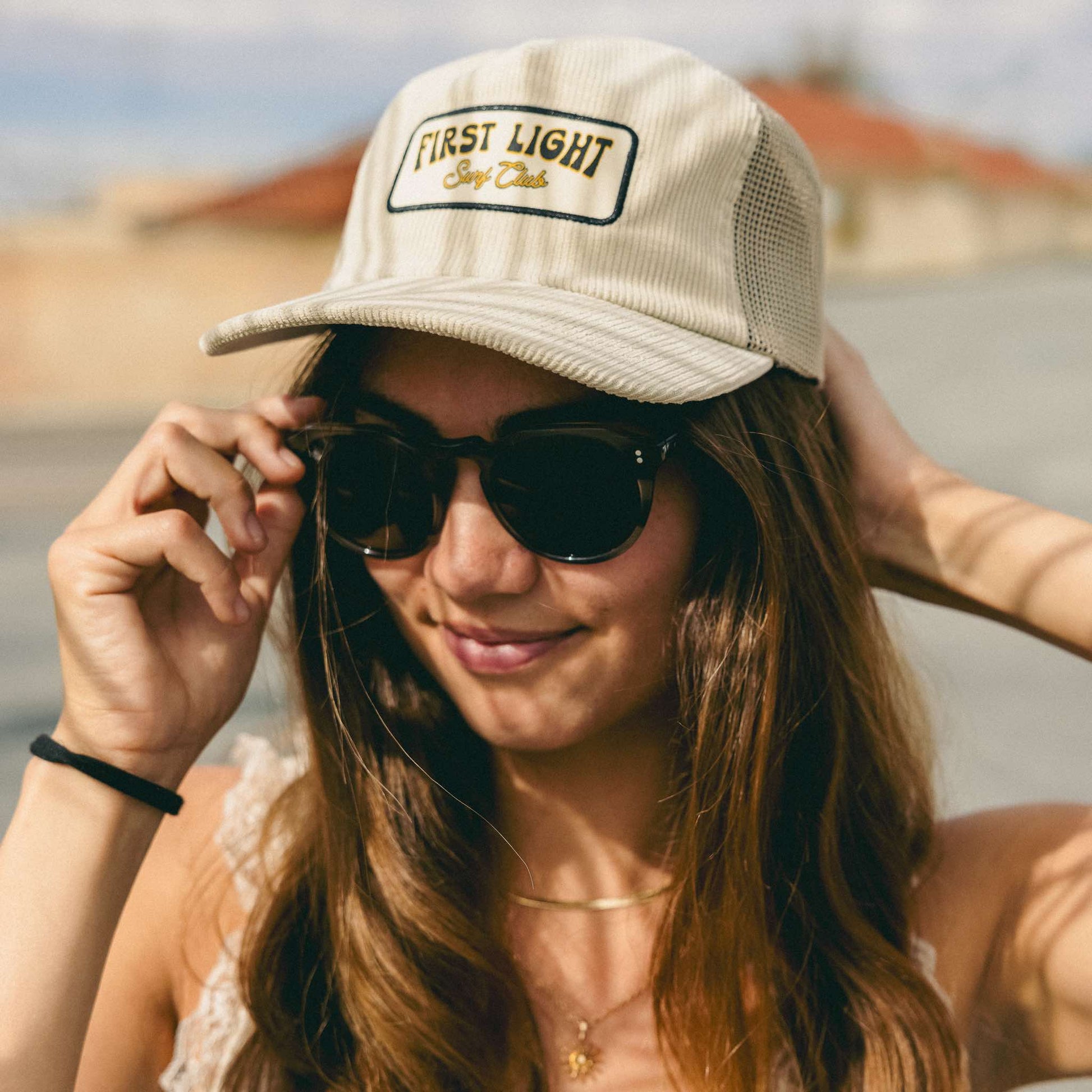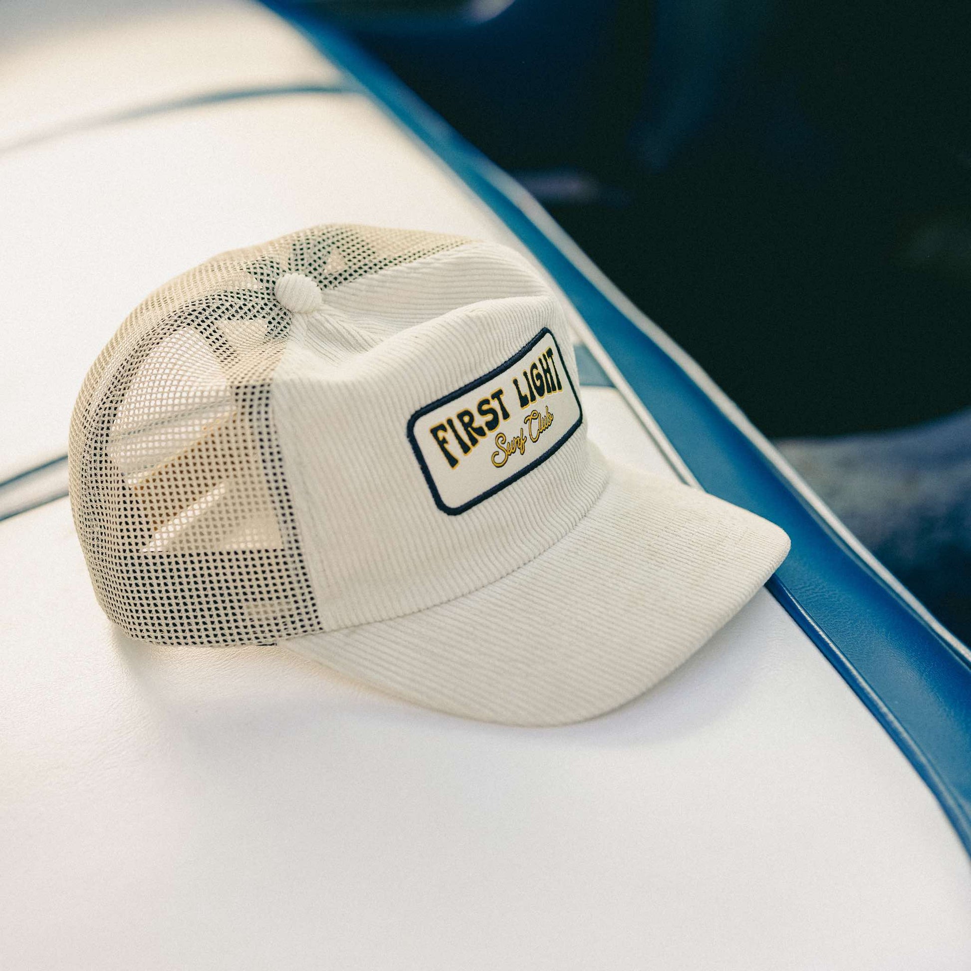 The First Light Corduroy Trucker is making headlines! It's a classy take on your classic trucker hat with a corduroy front and trucker mesh in the back. This hat is perfect for keeping your melon cool on warm summer days and stylish both on and off the sand. Complete with a First Light Surf Club patch on the front, happy lil coffee mug tag on the back, and a woven label on the inside to remind you to get in the water early and into work on time-ish.